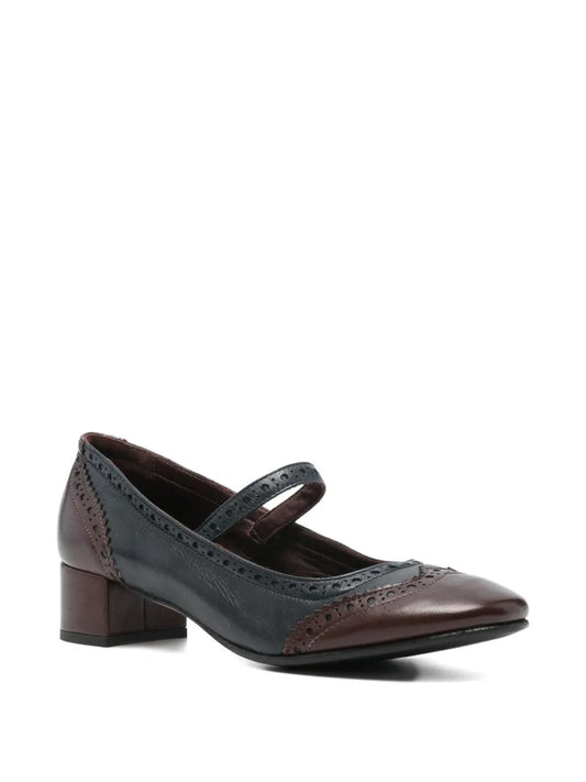brown and navy blue leather brogue detailing Mary Jane strap low block heel pointed toe