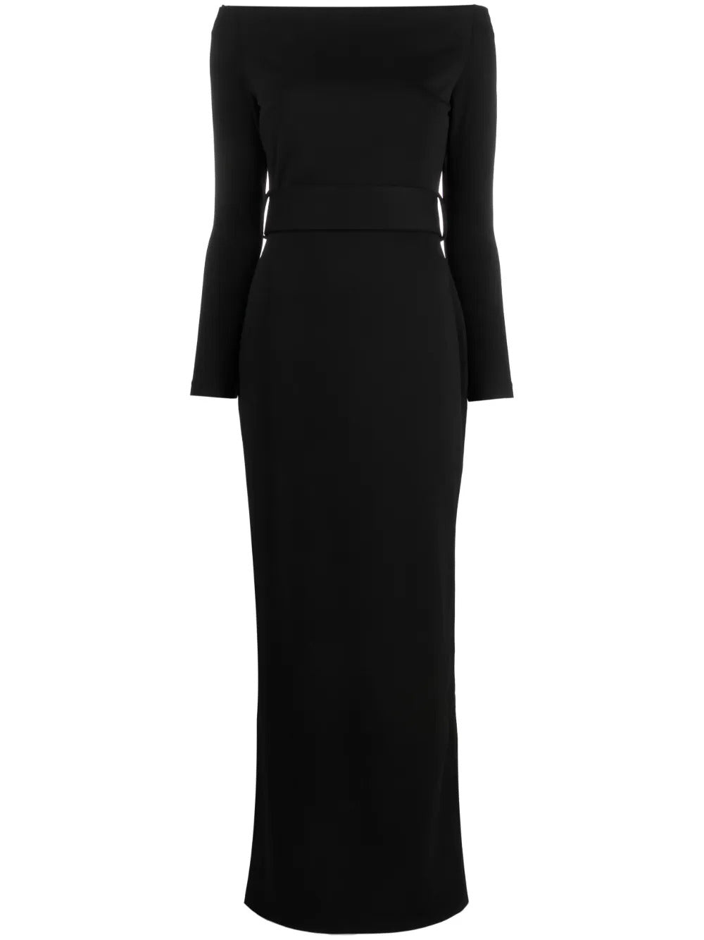 Nero, trama effetto crêpe, modello con cintura, design con spalle scoperte, maniche lunghe, chiusura posteriore con zip, spacco posteriore e design lungo.